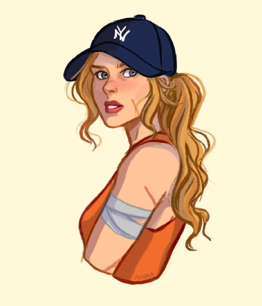 A full body illustration of a character with a single color background. Includes 2 revisions.