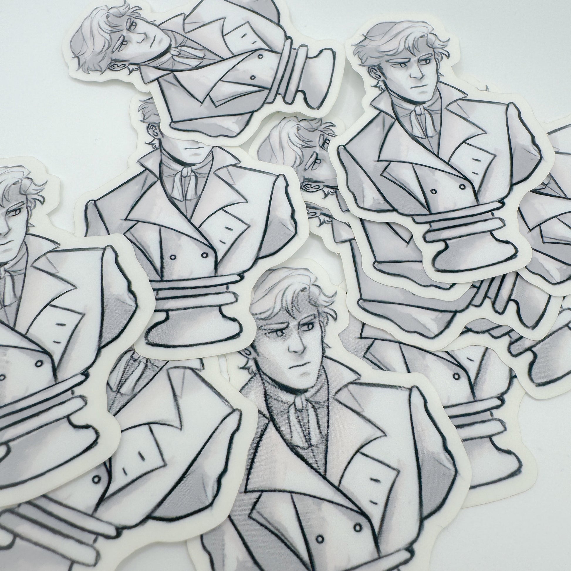 Elevate your love for classic literature with this Matte Clear Mr. Darcy sticker, featuring my illustration of Mr. Darcy's bust inspired by Pride and Prejudice. This water-resistant decal adds a touch of literary charm to any surface, making it perfect for laptops, notebooks, water bottles, and more.